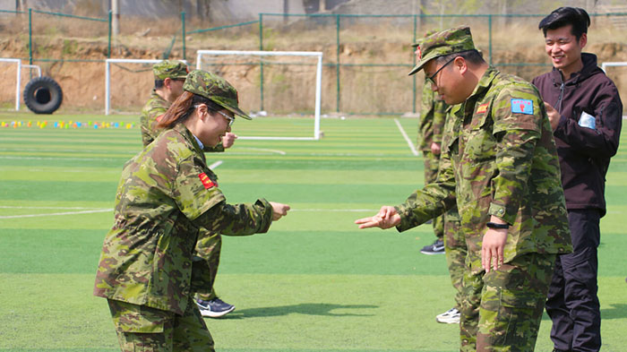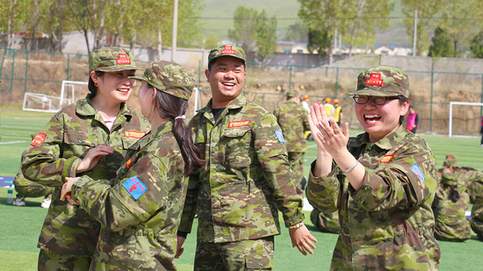 開訓(xùn)前,在破冰啟航環(huán)節(jié)——【智勇通關(guān)】項(xiàng)目中,每組選一個(gè)大魔王來防守別隊(duì),該隊(duì)隊(duì)員依次挑戰(zhàn)大魔王,石頭剪刀布定輸贏,贏了直接通過,輸了轉(zhuǎn)一圈,回來接著挑戰(zhàn),再輸即增加圈數(shù),直到全部隊(duì)員通過。大家把團(tuán)隊(duì)當(dāng)成了自己的“城堡”,在“對(duì)抗魔王”中,每個(gè)隊(duì)員都拼盡全力,期待被幸運(yùn)女神光顧,期待團(tuán)隊(duì)能盡早完成任務(wù),大家的歡笑聲、喝彩聲灑滿了訓(xùn)練場(chǎng)。
