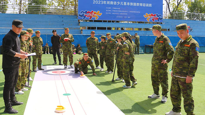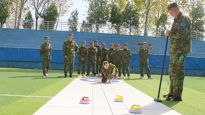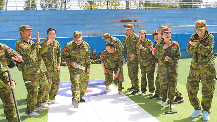 在【旱地冰壺】項(xiàng)目中,八個(gè)小組的隊(duì)員們一邊商榷對(duì)敵戰(zhàn)術(shù),一邊進(jìn)行任務(wù)分配。隨著一聲哨響,兩個(gè)賽隊(duì)同時(shí)開賽。隊(duì)員們?nèi)褙炞ⅰ⒛耢o氣,向前邁步?jīng)_刺,揮動(dòng)手臂擲壺,冰壺按照隊(duì)員們?cè)O(shè)想的路線擊打到對(duì)方的冰壺,使其滑出得分圈并穩(wěn)穩(wěn)地停留在中心點(diǎn),成功得分,大家歡呼雀躍,圍觀隊(duì)員們也紛紛叫好,掌聲、歡呼聲此起彼伏,好不熱鬧。