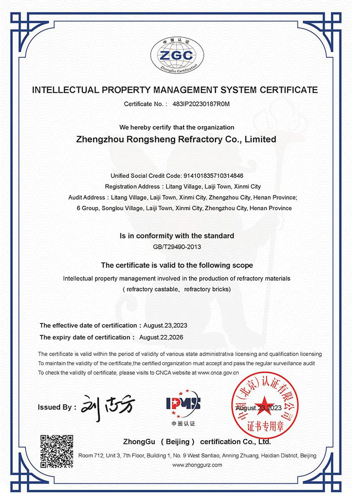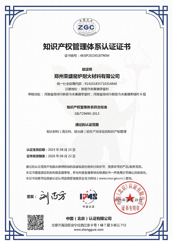 近日,鄭州榮盛窯爐耐火材料有限公司(以下簡(jiǎn)稱「榮盛耐材」)順利通過(guò)國(guó)家知識(shí)產(chǎn)權(quán)貫標(biāo)認(rèn)證,并獲得了《知識(shí)產(chǎn)權(quán)管理體系認(rèn)證證書》中英文雙語(yǔ)認(rèn)證。該項(xiàng)認(rèn)證的順利通過(guò),標(biāo)志著榮盛耐材構(gòu)建了一套規(guī)范化、系統(tǒng)化、程序化、精細(xì)化的知識(shí)產(chǎn)權(quán)管理體系。