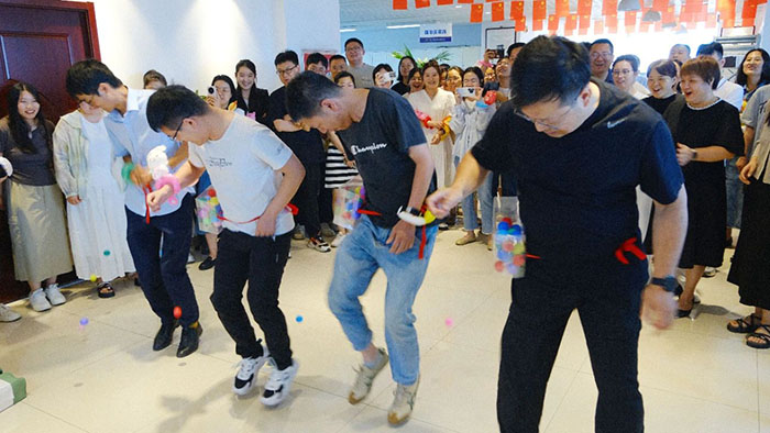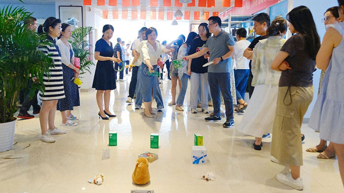 接著近半年入職的小伙伴們輪流登臺做自我介紹,并分隊開始進(jìn)行丟沙包。這邊用力擲出,那邊左閃右避,不時做出高難度跳躍動作。觀眾們的加油聲高過一陣又一陣,現(xiàn)場洋溢著青春活力氛圍。