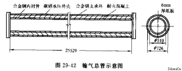 輸氣總管位于一段爐頂部,工藝氣體在轉(zhuǎn)化管轉(zhuǎn)化后,經(jīng)上升管匯集于輸氣總管,送到二段轉(zhuǎn)化管。工藝氣體溫度為870℃,工作壓力為3MPa(30.9kgf/cm2)。