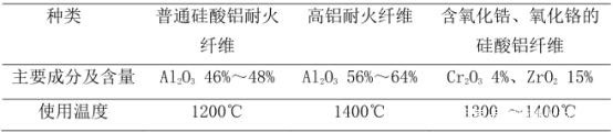 硅酸鋁耐火纖維又稱為陶瓷纖維,其主要組成是SiO2、Al2O3、Fe2O3、K2O、Na2O等,其中SiO2和Al2O3占95%以上,Fe2O3約占0.98%,K2O和Na2O約占0.5%。硅酸鋁纖維的表面光滑,內部固相物質以連續骨架形式存在,配合間隙中的低熱導率空氣,起到了保溫效果。生產硅酸鋁耐火纖維的方法是將精選的焦寶石原料在2000℃以上的電爐里融化,再采用噴吹或離心等方法使之纖維化。硅酸鋁耐火纖維按照其成分和使用溫度可以分為3類,如表2所示: