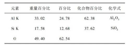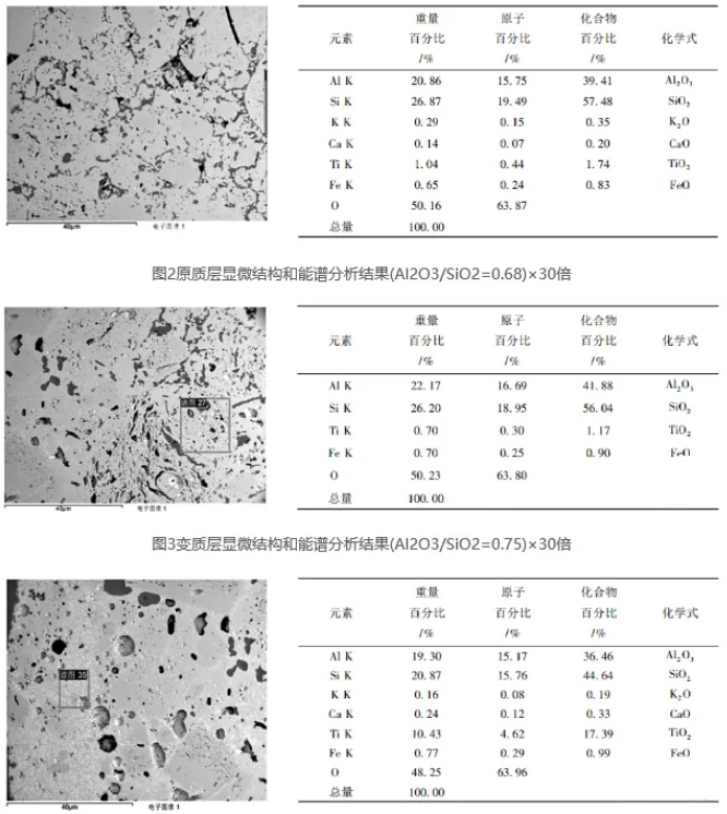 從熱力學上看,Al₂O₃-SiO₂系材料[4]各物相在氯化反應(yīng)中:莫來石相(A₃S₂)非常不穩(wěn)定,其成份見表2,石英相(SiO₂)非常穩(wěn)定,剛玉相(Al₂O₃)居中;在碳熱還原中:石英相非常不穩(wěn)定,剛玉相非常穩(wěn)定,莫來石相居中。在實際中,爐襯材料是如何損壞的,其過程是怎樣發(fā)生的,這要從殘磚顯微結(jié)構(gòu)分析入手。